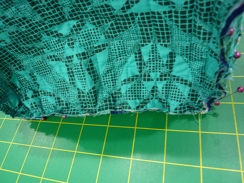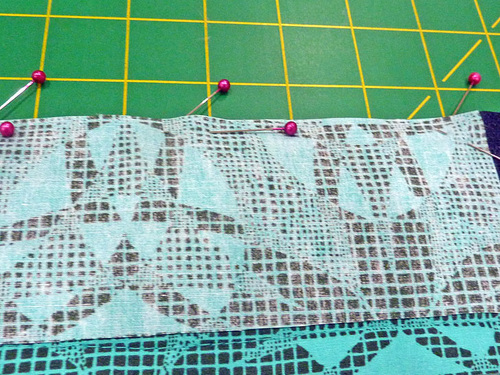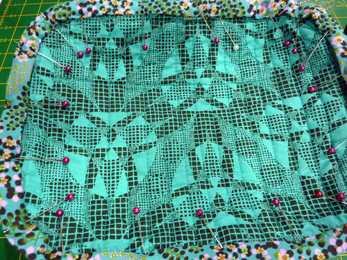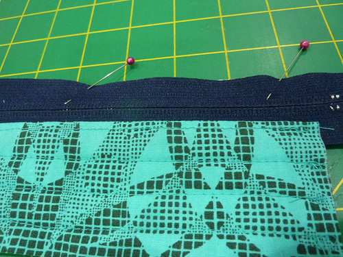 - Find the quilted base panel and the quilted zipper panel. Place the base panel right sides together with the zipper panel, forming a loop, Make sure to match up the quilting lines on the two layers. Pin in place.