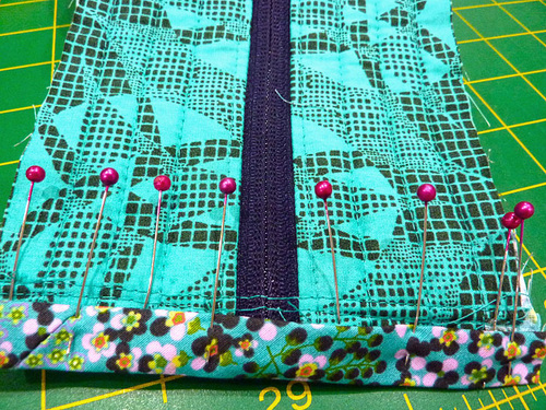 - The top raw edge of the exterior panel should be aligned with the top raw edge of the lining panel and the zipper tape. Re-pin through all three layers.