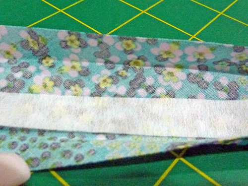 - Find the 13” wrist strap strip. Fold it in the same manner as you did above with the binding and find the small strip of interfacing.