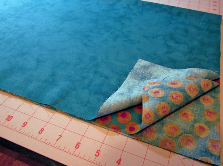 - Place the exterior rectangle right side down on top of the interior piece. Align all four raw edges of both layers.