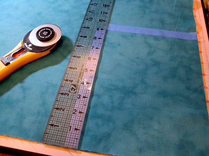 - Mark the first corner cut. It should measure 9″ up from the bottom raw edge and 7″ in from the side raw edge. Make sure your measurements come together at a perfect right angle (a 90˚angle). You can draw your lines with a fabric pen or pencil, or mark with painter’s tape as a cutting guide as we did.