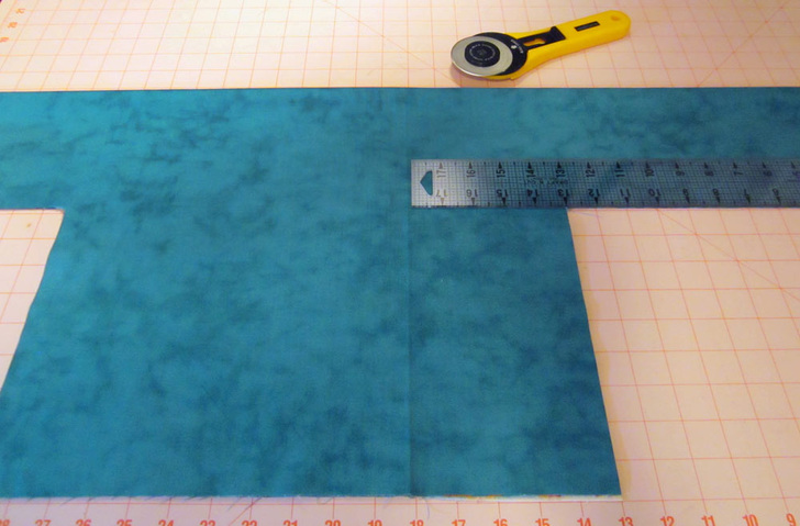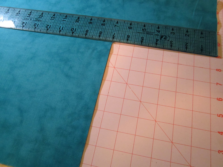 - Rotate the fabric to cut the opposite corner notch. This notch should also measure 9″ up from the bottom edge, but should be 13″ in from the side edge. Again, make sure you have an accurate 90˚ angle.