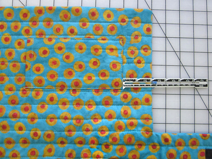 - As above, the strips run perpendicular to the quilting stitching and are 1¼” from the side and ½” up from the bottom. Edgestitch in place as above.