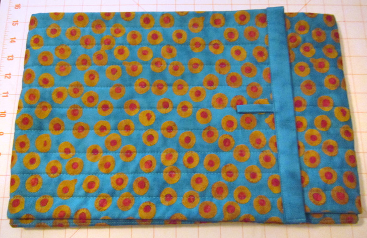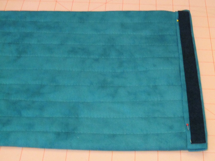 - Re-fold the binding strip wrong sides together so all the folded edges align. Slip the binding over the raw edges of the open end of the carrier (the end you used for turning right side out). The side with the Velcro® should be on the inside. Pin in place.
