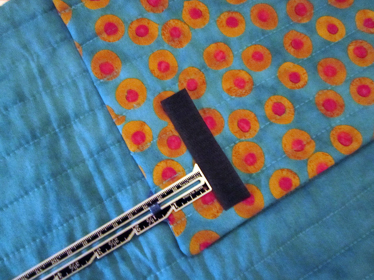 - Position one in each corner of the bottom middle wing, and one in each corner of the short end. The strip should be positioned perpendicular to the quilting lines on the middle wing and parallel to the stitching on the end. Position the strip 1¼” in from the side and ½” up from the bottom.