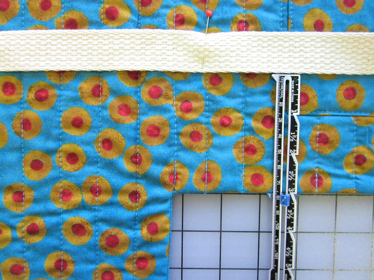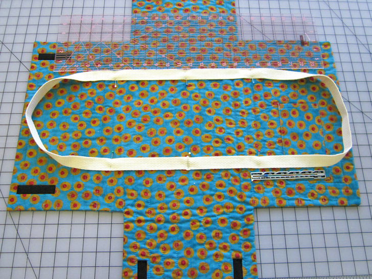 - Unfold and center the handle across the middle of the carrier. It should be positioned so the zig zag seam and the opposite center pin point (the point you marked above when you folded the handle) are both aligned with the center quilting line. The outer edge of the webbing should be 3″ in from the edge of the carrier. Pin the loop in place from the center point outwards, stopping 1″ beyond each inner corner. This end point should align with a line of quilting.