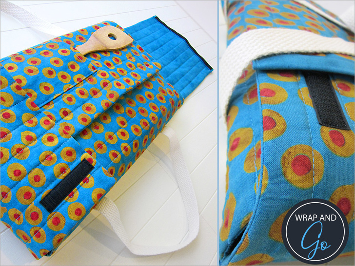Our carrier is made for a standard 9″ x 13″ covered baking pan. You’ll want to measure your particular casserole dish and adjust the four “fabric wings” to fit. We noticed many newer dishes have large molded handles. This would definitely be something you’d need to account for, especially for the short bottom and long top wings.