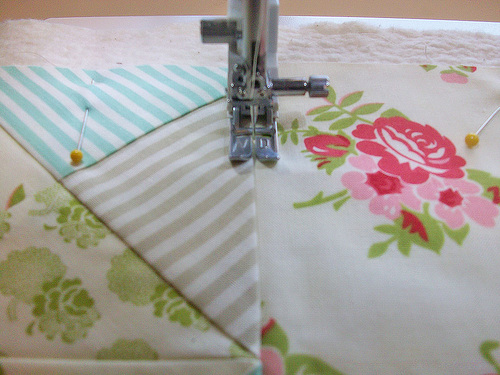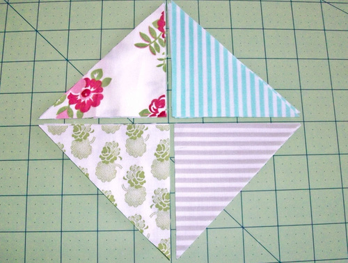 - Starting with one set of four, place the top two triangles right sides together, aligning their center sides. Pin in place. Stitch together, using a ¼” seam allowance.