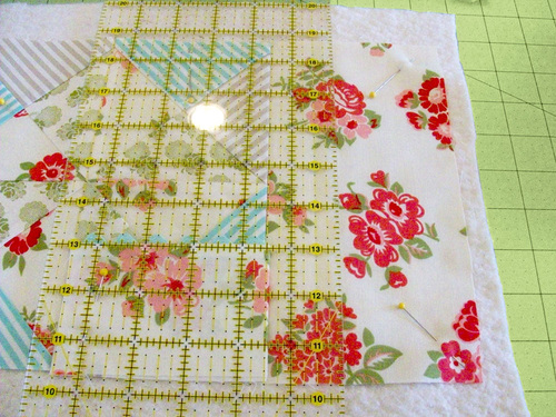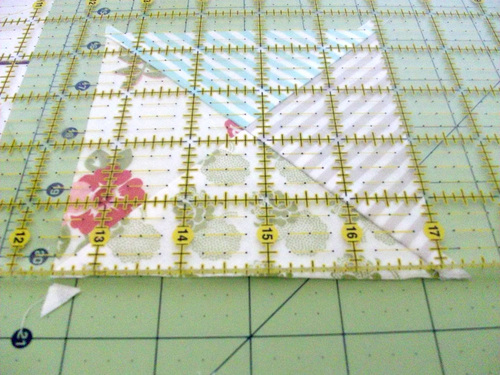 - Because you’re working with triangles, you’ll end up with little “dog ears” at each corner. Trim these away so all four sides of the square are flush.