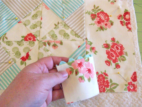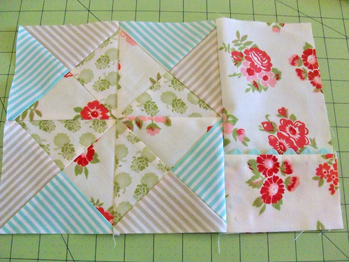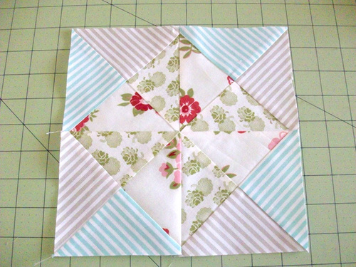We wanted four different fabrics within each of our squares, which is why we didn’t do traditional half square triangles. You can, of course, vary the look to match your own favorite method. You’d want your four finished squares to each end up at 4.5″ x 4.5″ .