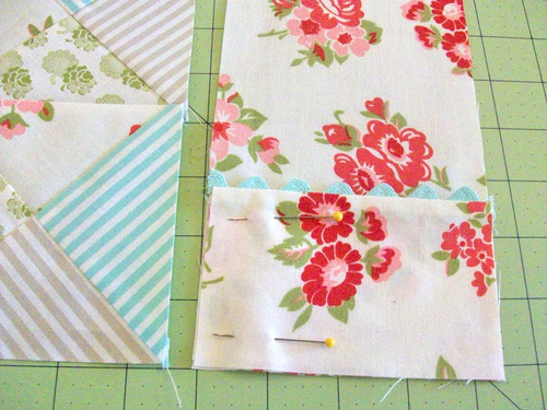 - Place the finished pocket on top of the base pocket panel, aligning the bottom raw edges and the sides. Pin in place along the left side only.