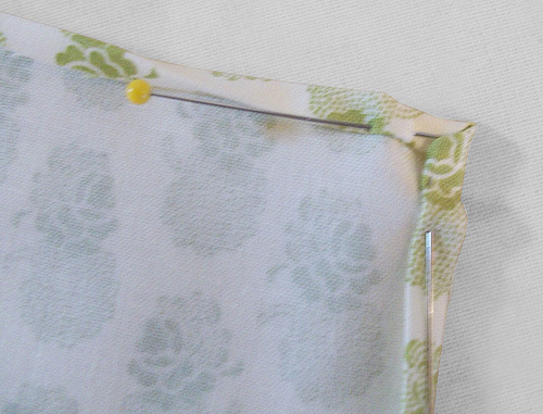 - Press each side to create a narrow double turn hem with clean diagonal point corners.