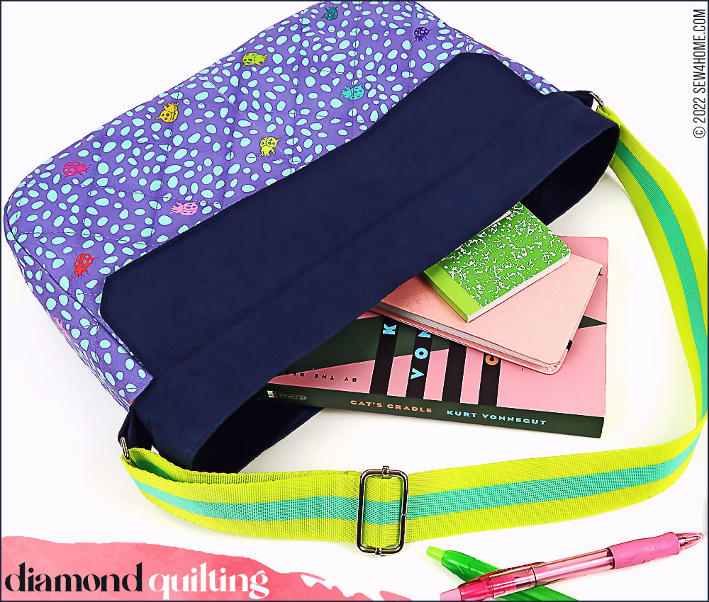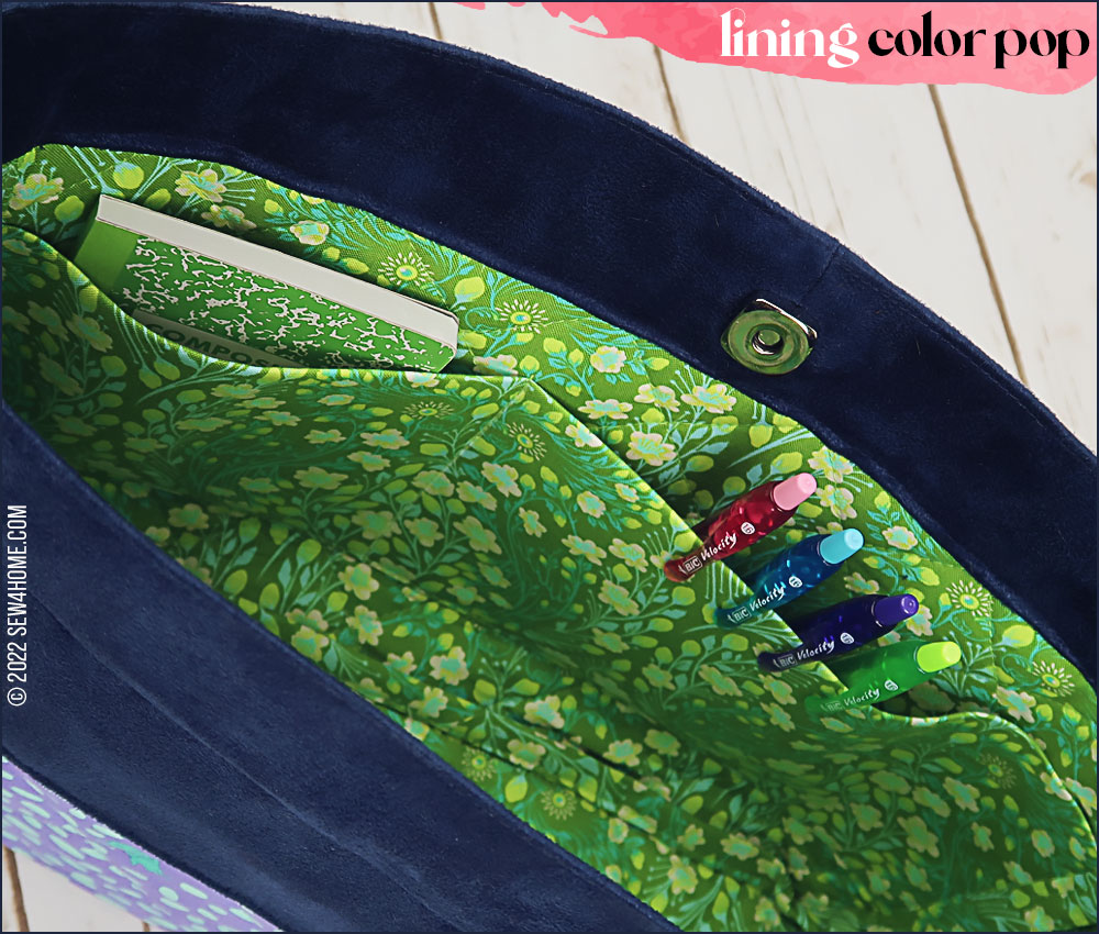 The body of the bag as well as the sidewall have intersecting diagonal lines of quilting, which provides a wonderful softness and a subtle bit of texture. We show you how you can draw in stitching guide lines or use a Quilting Guide Bar to create the perfect diamond pattern. We took advantage of Janome’s built-in AcuFeed™ Flex fabric feeding system to keep all the layers moving evenly under the needle; a standard Walking or Even Feed foot would also work well.