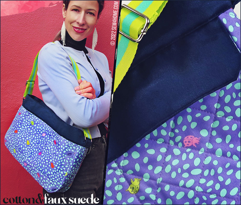 The whimsy that is classic Tula (our fabric is from her older, Monkey Wrench collection) is paired with a solid faux suede for the upper trim and the clever front flap. That unique flap covers the double front pockets, helping conceal and protect their contents. We designed the flap to be able to hang down, straight and flat. There’s no need for a clasp, making it quick and easy to lift up for pocket access. However, there is a magnetic snap to secure the top of the bag.