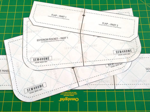 - Download and print the pattern elements: Front-Back Body, Exterior Pocket, Front Flap, and Side Panel, which are made up of NINE pieces to assemble. The eight pattern pages have been bundled into ONE PDF to make the download easier.