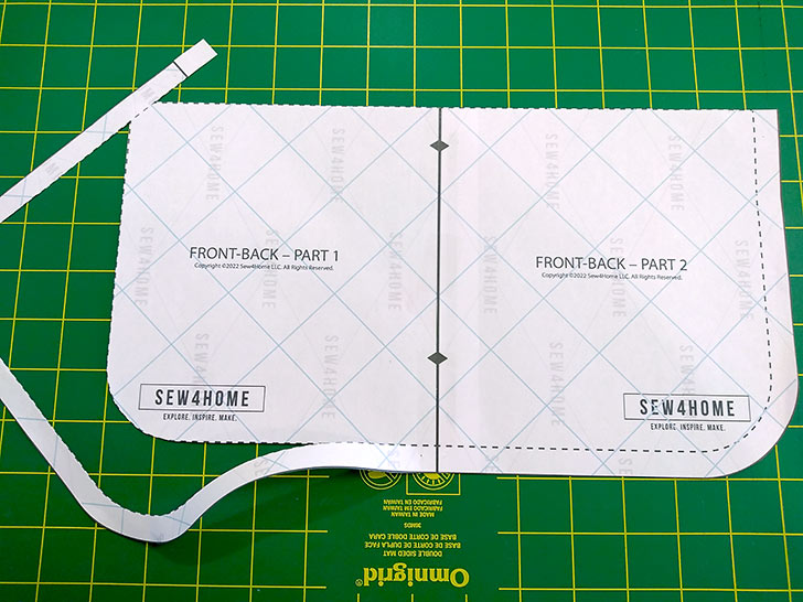 - For the Exterior Pocket pattern, aligning the printed arrows, assemble the TWO pieces into the complete pocket pattern.
