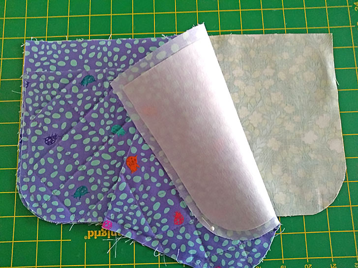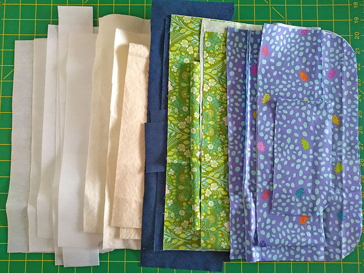 - Find the two exterior pocket panels and the one coordinating panel of batting.