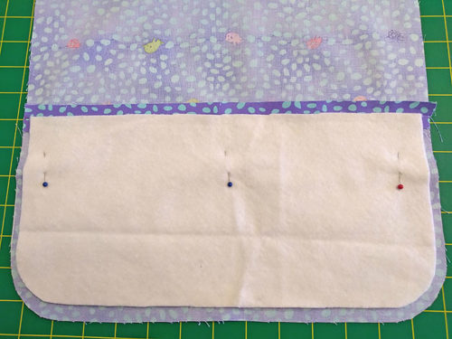 - With the sewn pocket still flat and wrong side up, place the batting panel into position. The upper edge of the batting should just cover the seam by about ⅛”. Along the sides and bottom, there should be ½” of fabric showing beyond the batting. Lightly pin in place.
