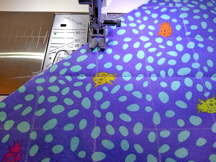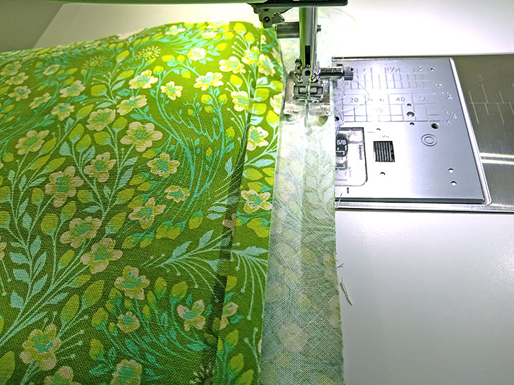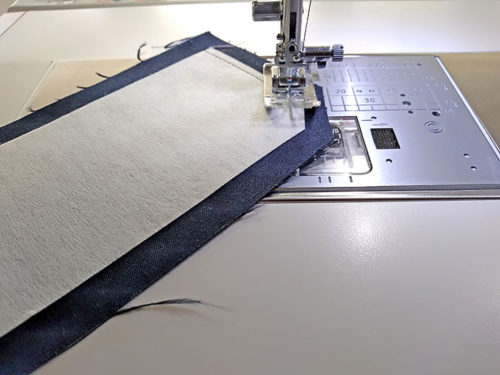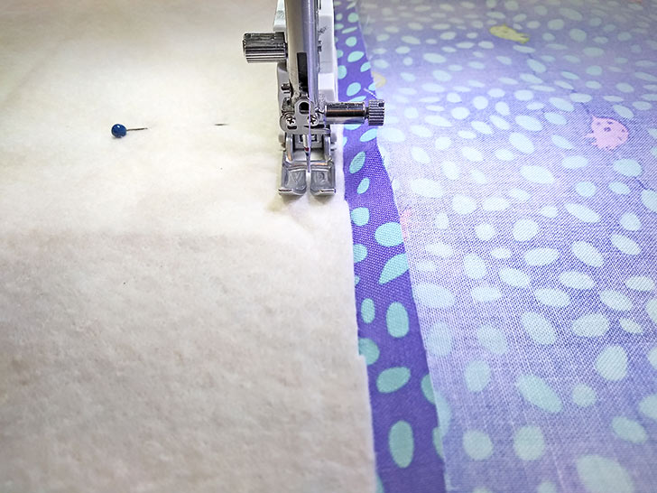 - Lengthen the stitch to its maximum and machine baste across the top of the batting. This will help prevent the batting from shifting away from the seam.