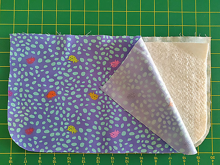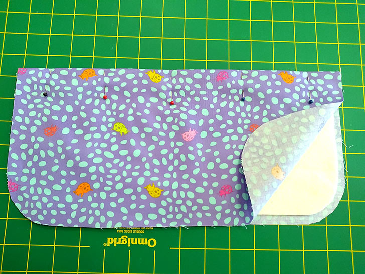- Fold the pocket layers wrong sides together, sandwiching the batting between the layers. (You can remove the pins the were lightly holding the batting in place above.) The seam should run straight across the top and the raw edges of the two pocket layers should be flush along the sides and across the bottom. Lightly pin through all the layers.
