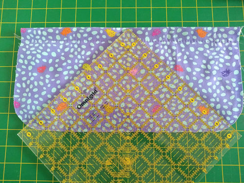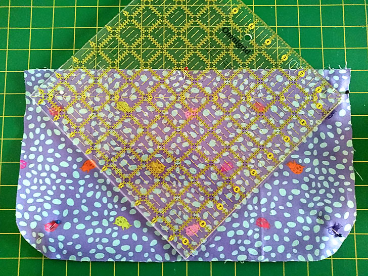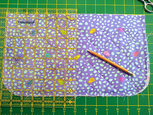 - Mark this panel in the same manner as you did for the front exterior pocket. If you are using a Quilter’s Square-Up Ruler as we did, position it with the point at the center lower edge. This will result in an exact match to the front pocket quilting.