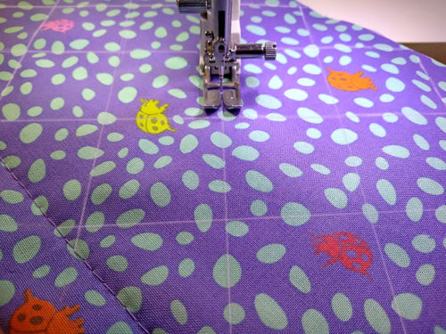 - The quilting lines are also added with the same spacing to create the diamond pattern. We opted to use a Quilting Guide Bar for the stitching on this narrower side wall. This way, we needed to only draw in one starting line in each direction and could simply set the Guide Bar at 1½” to stitch the subsequent lines.