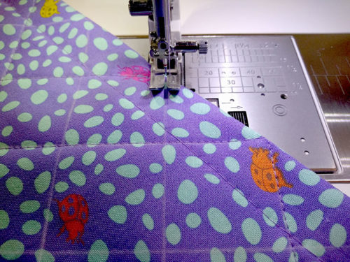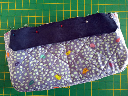 - With the side wall quilted, you can add it to the front and back panels. We started with our back panel, but the choice is yours – front or back, it doesn’t matter.