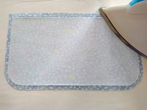 - Center the interfacing on the wrong side of the front panel. There should be ½” of fabric showing beyond the interfacing all around. Following manufacturer’s instructions, fuse in place.