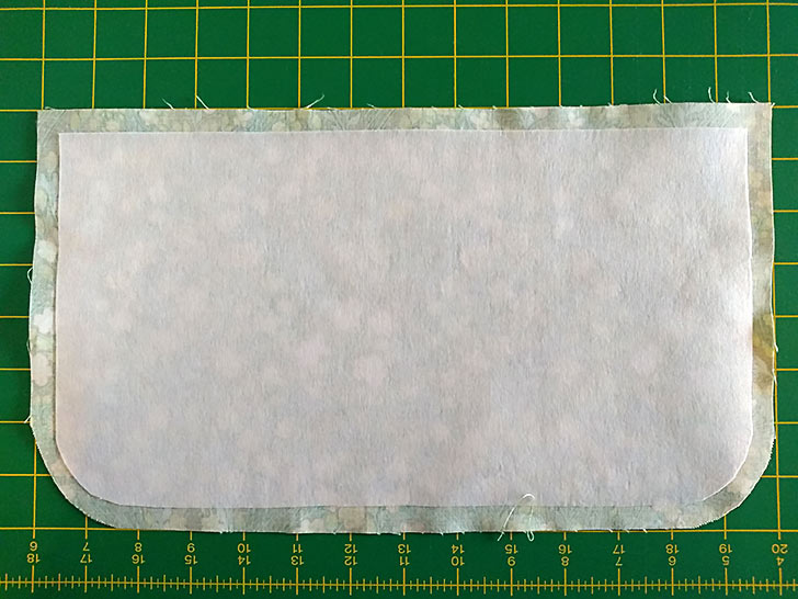- Center the interfacing on the wrong side of the exterior panel so there is ½” of fabric showing beyond the interfacing all around. Following manufacturer’s instructions, fuse in place.