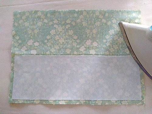 - Place the interfacing panel into position on one half of the fabric panel. The top edge of the interfacing should sit along the center crease line. There should be ½” of fabric showing beyond the interfacing along the sides and across the bottom – and, of course, the upper part of the fabric has no interfacing at all.