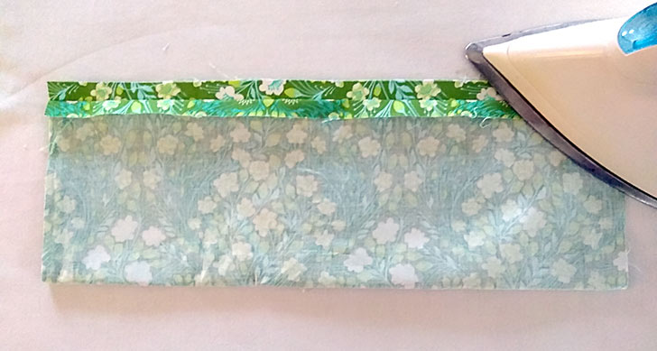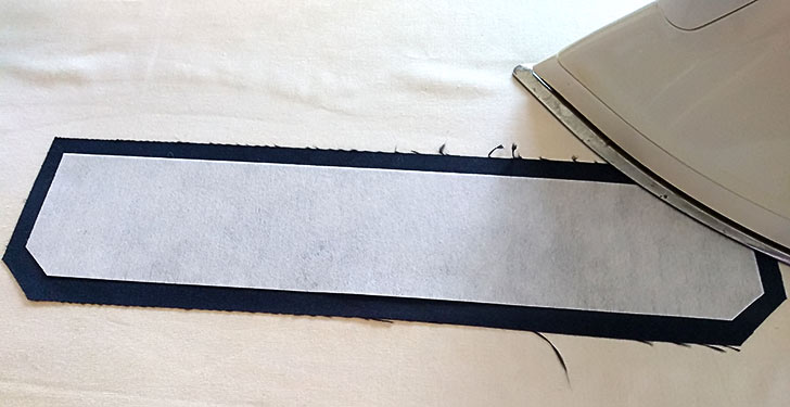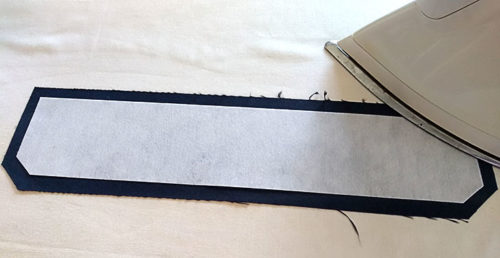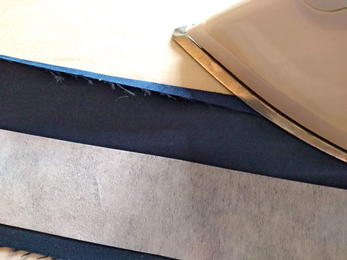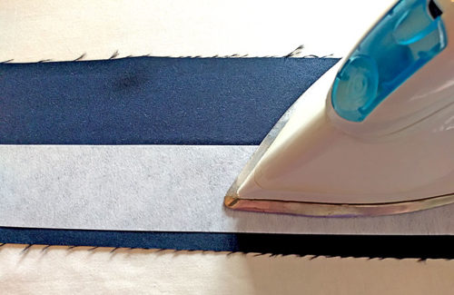 - Along the non-interfaced half of the trim, fold back the long raw edge ½” and press well to set a crease.