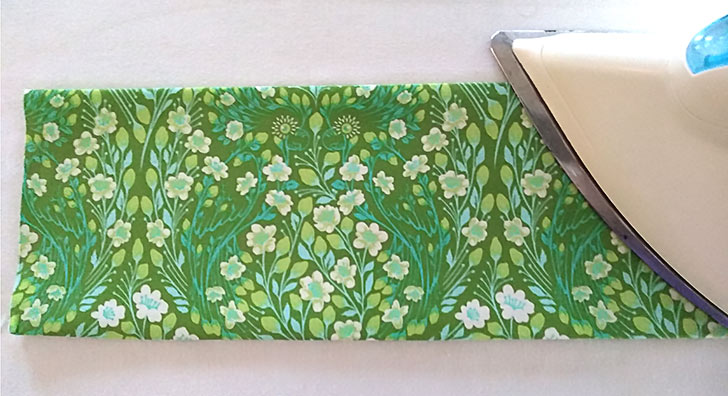 - Fold the fabric panel in half so it is now 14” x 5” and press to set a crease.