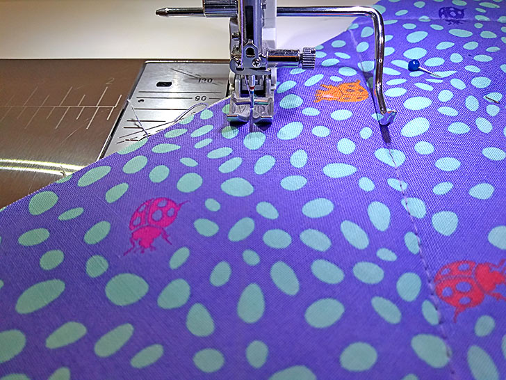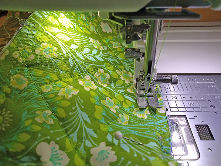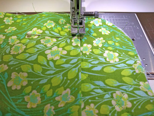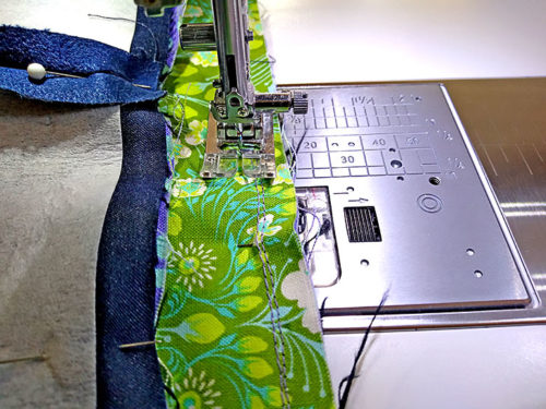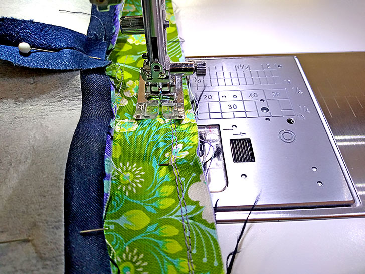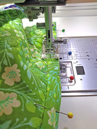 - When you get to the upper edge, slow down so you can watch each stitch. Take ONE stitch off the top seamed edge (onto the plate), stopping with the needle in the down position. Lift up the presser foot and pivot so you are now ready to stitch the adjacent line. This creates a very nicely finished upper edge to the pocket without the need to backstitch!