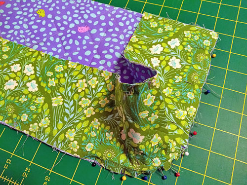 - Using a ½” seam allowance, stitch the side wall in place against the back panel. In the photo below, you can see how we clipped into the corner for that extra ease, and you can also see we used plenty of pins to hold everything together.