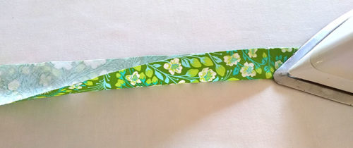 - Unfold the strip wrong side up so the crease line is visible and press each long raw edge into the center to meet at the crease.