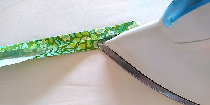 - Find the 2” bias strips of lining fabric you cut and stitch them together end to end to create an approximate 60” length. Use a ¼” seam allowance to stitch together the strips, then press each seam allowance open and flat.