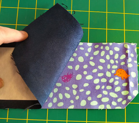 - Find the three pieces that make up the front pocket flap: the front faux suede panel, the cotton lining panel, and the coordinating interfacing panel.
