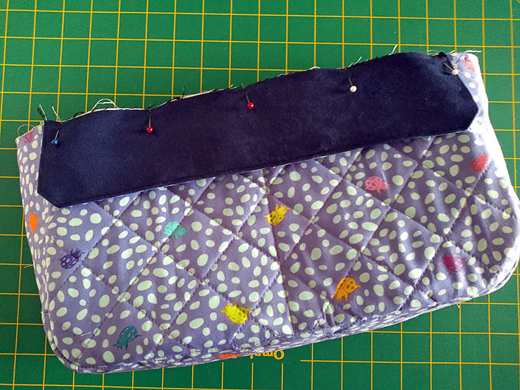 - Position the flap on the front of the bag – so it covers the top of the front pocket. The top raw edge of the flap should be flush with the top raw edge of the bag front. Center the flap side to side. Pin in place across the top of the flap.