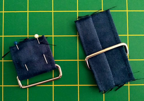 - Find the two 4” x 3” faux suede rectangles and the two 1½” D-rings.