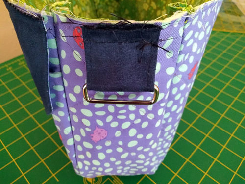 - Position a tab at each side. The raw ends of the tab should be flush with the top raw edge of the bag, which means the D-ring is hanging down. The tab should be centered within the side wall.