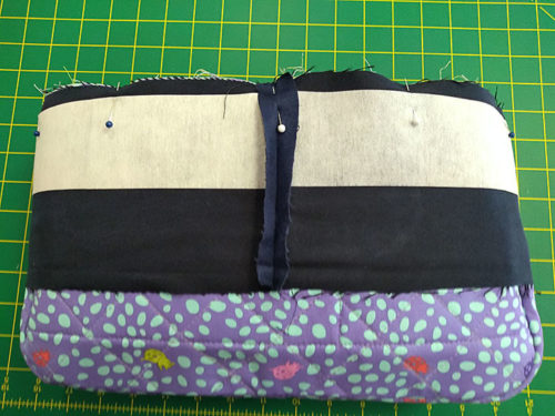 - The loop should still be wrong side out. Slip the loop over the top of the bag with the interfaced half of the loop nearest the top of the bag. The seam of the loop should be centered at the back of the bag. The raw edge of the loop should be flush with the top raw edges of the bag, sandwiching the flap and the tabs between the layers. Pin in place around the entire top of the bag.