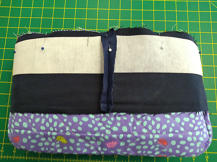 - The folded edge of the trim loop should completely cover the upper seam allowance on the inside of the bag. Lightly pin in place.
