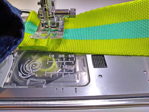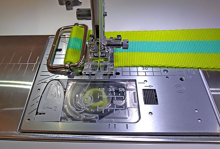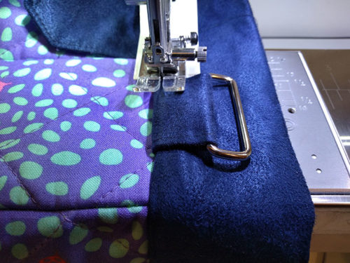 - As you approach each D-ring tab, you will be going over quite a few layers, we recommend leveling your foot with a Hump Jumper to more easily stitch across. You can see the Hump Jumper behind the presser foot in the image below.