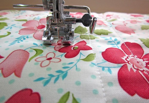 - Stitch the piping in place all around the bottom edge, keeping your seam line as close to the piping cord as possible.
