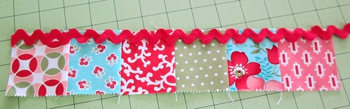 - Place a length of rick rack along both long sides of the strip. The outer waves of the rick rack should be flush with the raw edges of the strip.