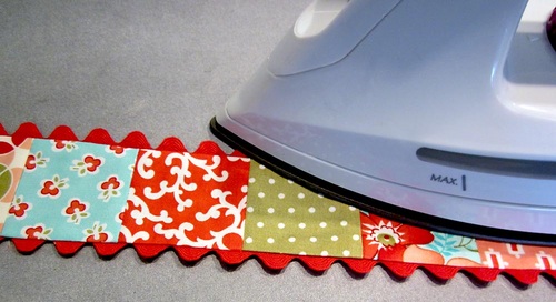 - Fold back along the seam line, pressing the raw edges to the wrong side. This will make the rick rack “pop up” along the top and bottom of the strip.