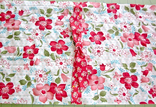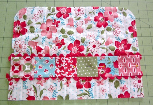 - Place the completed strip on the quilted front panel so the bottom edge of the strip is 2″ above the lower raw edge of the panel. Pin in place.