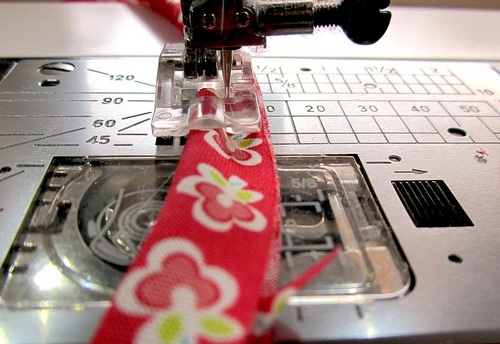 - Using a Piping foot or Beading foot (optional), sew close to the cording to create your fabric covered piping.