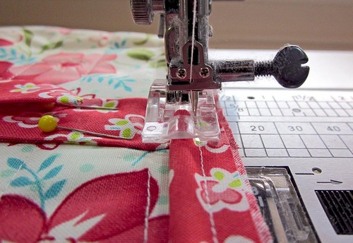 - Attach a Zipper foot. Using a ¼” seam allowance, stitch all around this bottom edge, leaving a 5-6″ opening for turning.