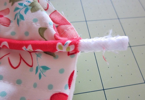 - At both ends along both sides, remove excess cord from the piping by pulling the cord out and trimming about ½” from the end. Let the remaining cord slide back into the fabric sleeve. This will make it easier (thinner) to attach the piping around the bottom.